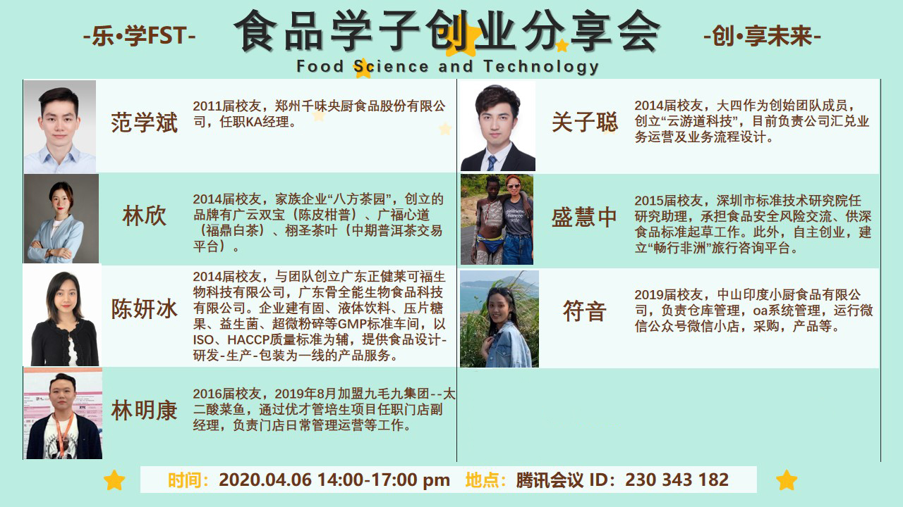 北师港浸大(UIC)的历届毕业生中不乏创业佼佼者及活跃在各行各业的优秀人才,他们的创业及职业之路是怎么样的?食品科学与工程专业(FST)于2020年4月6日下午邀请了7位校友为同学们分享了他们毕业后的创业及就业经历。分享会由FST课程主任徐宝军教授主持。