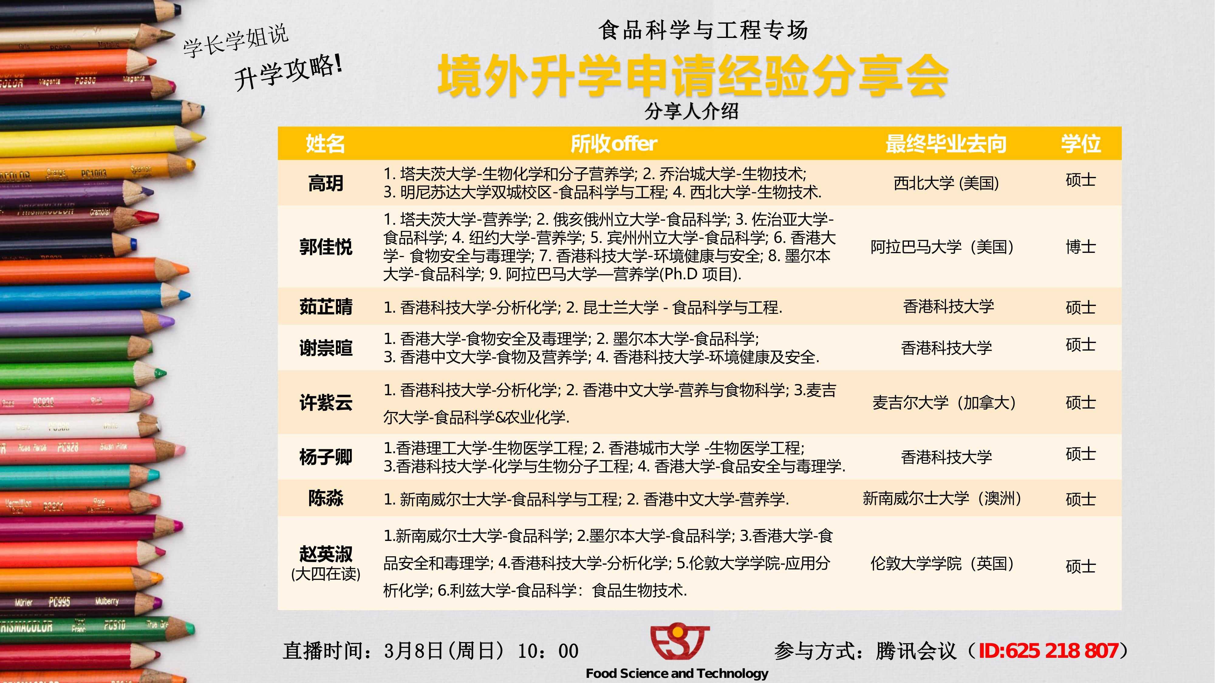 分享的最后,目前食品与工程系大四在读的赵英淑学姐则重点分享了自己的最终申请到英国UCL授课型硕士的过程以及自己学习经验。赵英淑学姐目前已经收到了7所学校的offer,分别有新南威尔士大学-食品科学、墨尔本大学-食品科学、香港大学-食品安全和毒理学、香港科技大学-分析化学、伦敦大学学院-应用分析化学、利兹大学-食品科学: 食品生物技术以及爱丁堡大学-药物发现和转化生物学,并最终选择了将会于伦敦大学学院-应用分析化学就读。她谈到,自己的在空余时间会参加义工活动并参加学校的暑期项目以为自己的CV增色,并在大一大二期间前往了新加坡南洋理工以及香港浸会大学进行了学习。她希望同学们能够将自己的时间规划好,尽量和社会多接触并且明确自己未来的规划与目标。
