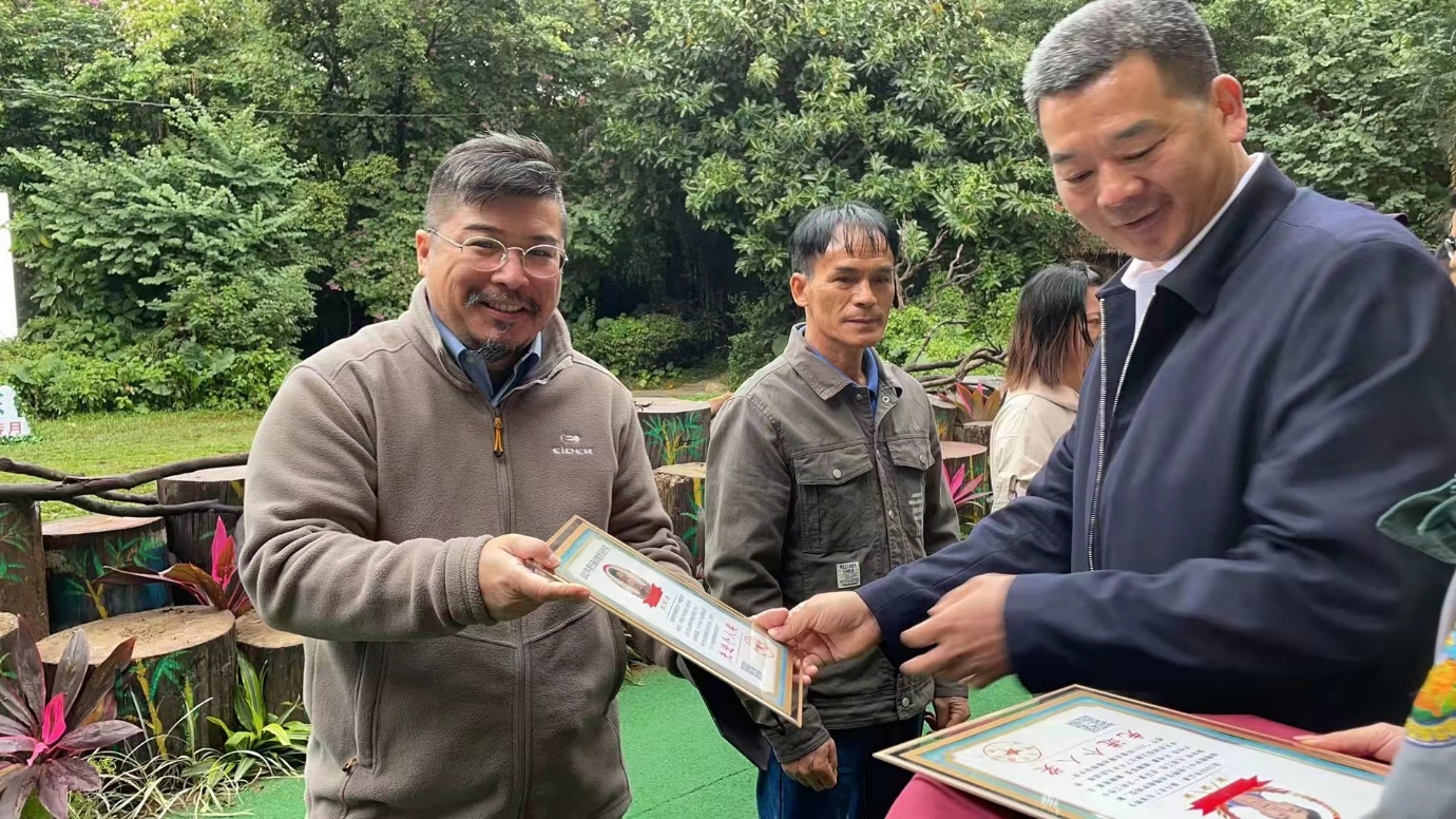 广东省林业局副局长王华接(右)向詹肇泰博士(左)颁发获奖证书