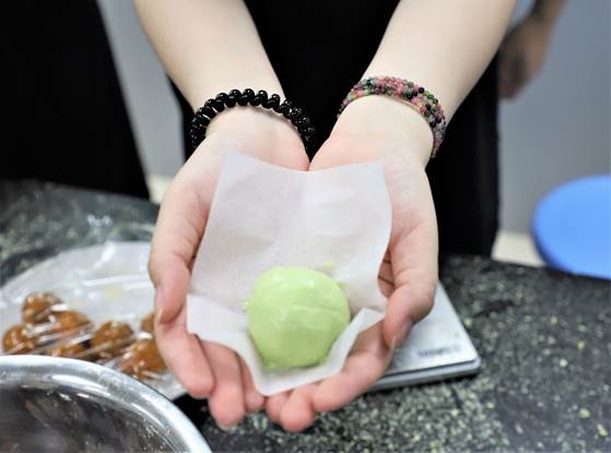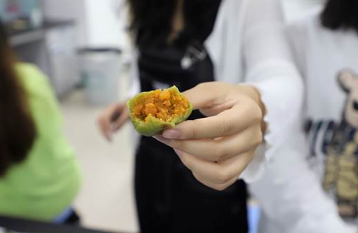 “捣青草为汁,和粉为团,色如碧玉”。将馅料放入面皮后将其揉成球状可不是一件简单的事,咸蛋黄馅(本身为球状)不易失败,红豆沙与芋泥馅可是重灾区,多次发生馅料外逃事件……为了区分各自的青团,大家还给自己的青团做上了特殊标记。为确保食品安全,大家在制作之前都佩戴了帽子与手套,制作途中场面一度十分热闹。