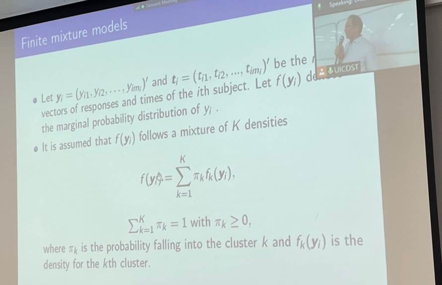 第一个例子是对欧洲51个国家根据每周平均死亡数据进行分类。潘教授简单介绍了有限混合模型,并指出,在实际问题中,我们需要对均值和方差都要做模型。他讲到,这就是在高维空间对高维函数做优化。接着,潘教授指出此方法可以用在很多不同领域,如对芬兰工资的状况进行分类。第二个例子用到了英国每三年采集一次的老年人关节疼痛的数据。潘教授指出,由于三组数据来自同一个人,所以相关性要考虑进去,三个模型同时分析。最后得出结论:女性关节疼痛的概率比男性要高。