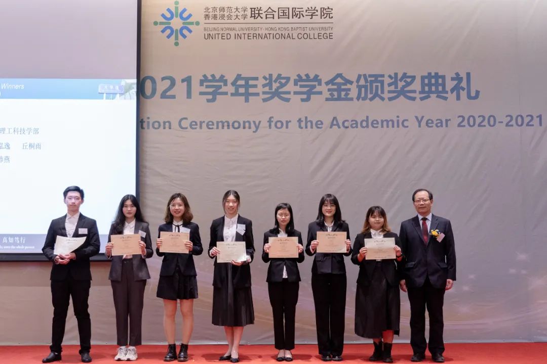 2020-2021学年奖学金颁奖典礼上,潘建新教授(右一)为院长推荐奖学金获得者颁奖