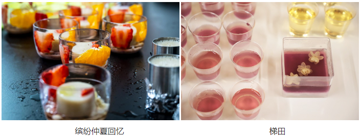 第一组产品:缤纷仲夏回忆。设计理念源于对热情缤纷的夏天的憧憬与回忆,炎炎夏日,少不了由白凉粉制成的清凉爽口的果冻。蜜桃乌龙茶和柚子茉莉花茶用于制作产品果冻主体,中间悬浮的果冻则由低糖燕麦奶制成。伴随三种洋溢着夏日气息的新鲜水果,以及水果麦片作为果冻底层。清新的果茶香、酸甜多汁的水果、香醇的燕麦奶和酥脆的麦片,是多种颜色、风味、口感的结合,旨在为品尝者带来一场视觉和味觉的盛宴。第二组产品:梯田。第一勺,是茉莉花的清香与茶的淡淡苦涩,晶莹剔透的棕绿宛如湖水,白色小花在湖中荡漾,温柔而治愈;第二勺,是多肉葡萄的香甜,清凉爽口,高饱和度的紫色,淡雅且诱惑;第三勺,是椰奶的浓郁和香醇,嫩滑Q弹,搭配富有嚼劲的椰果,口感丰富而有层次。一勺见底,茶味、果味与奶味的奇妙碰撞,降燥又解腻,仿佛置身田园,那一切的疲惫,就此抚平。