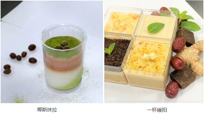 第八组产品:椰斯抹拉。这是夏日清新与零卡糖健康的碰撞,也是甘甜和清苦的交织。Q弹清爽椰奶,糯滑抹茶,绵密咖啡慕斯。愿给你味蕾带来无与伦比的满足,并赋予满满的生机与活力。第九组产品:一杯暖阳。中国传统味道和西式甜品交融,生姜带来微醺般的暖意与慕斯的冰爽完美碰撞,在初夏的气氛里,品尝那第一口暖阳。