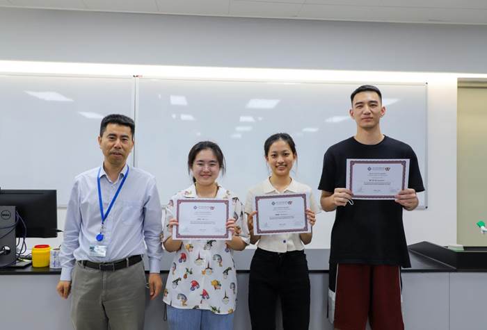 潘建新教授(左一)为最具商业价值产品“一杯暖阳”颁奖