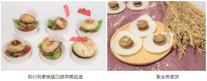 第六组产品:我行我素植蛋白蔬萃菌菇堡。你是否还在为自己是素食主义者而尚未品尝到汉堡的味道而感到遗憾呢?你是否还在因为减肥期间而无法摄入高热量的食物而感到沮丧呢?那就快来尝一个美味又健康的素食小汉堡吧!一个小汉堡的重量仅38.5克,热量仅有45千卡!不用担心吃不完而浪费,不用担心吃多了而发胖!它的口感与味道和真实的汉堡相似度可达百分之九十九,既让你收获了健康的饮食又让你得到了品尝美食的快感!第七组产品:紫金燕麦饼。当薰衣草的紫色遇上向日葵的金色会让你的味觉产生怎样的反应?简单而又平凡的食材,却创造了出乎意料的美味。燕麦与香蕉的清香,紫薯和芋泥的香甜,低糖低脂的配方,都能在小小的燕麦饼中品尝到。