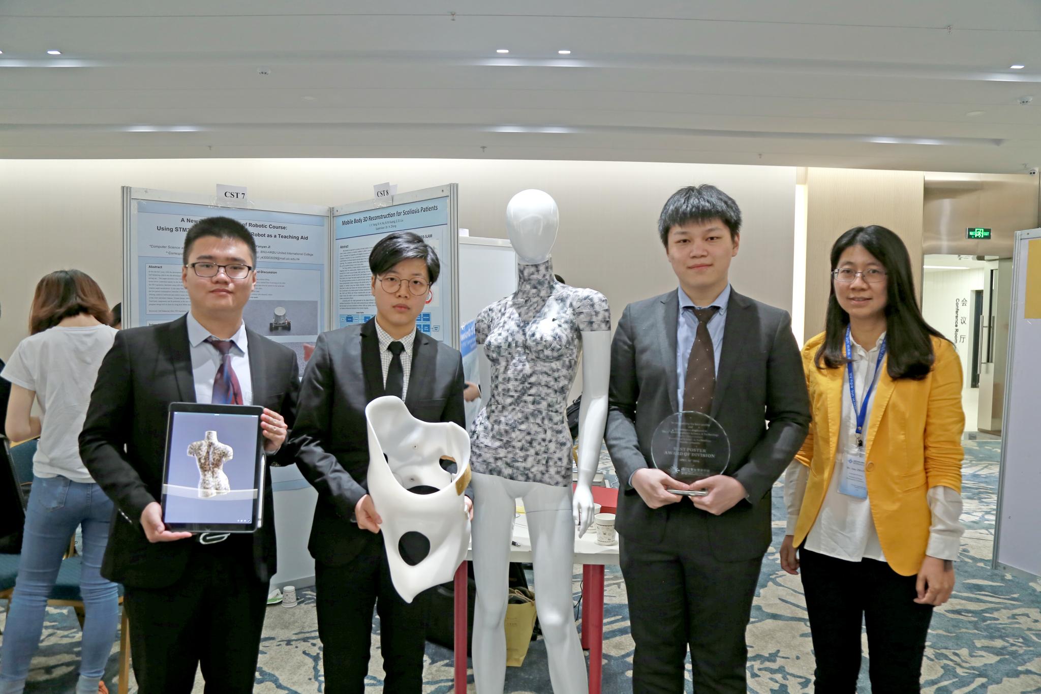 杨嘉宇与指导老师张慧教授(右一)、项目组同学在UIC理工科技学部海报展