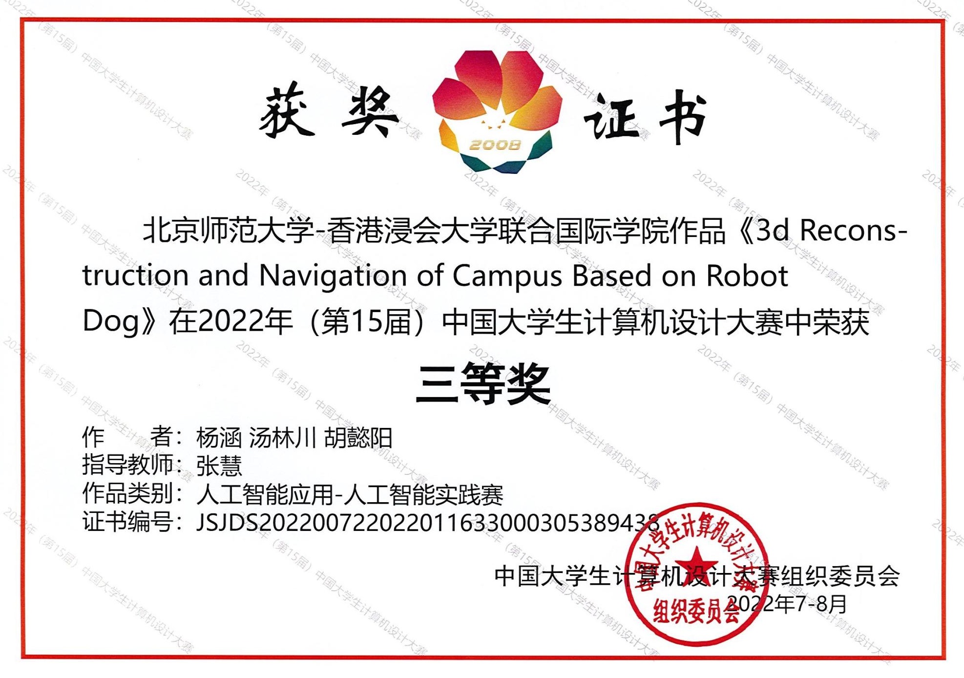 近日, 2022年(第15届)中国大学生计算机设计大赛落下帷幕,北师港浸大计算机科学与技术专业学生杨涵、汤林川、胡懿阳的作品《3d Reconstruction and Navigation of Campus Based on Robot Dog》(基于机械狗的自动导航与三维校园重建)荣获中国大学生计算机设计大赛国赛三等奖。