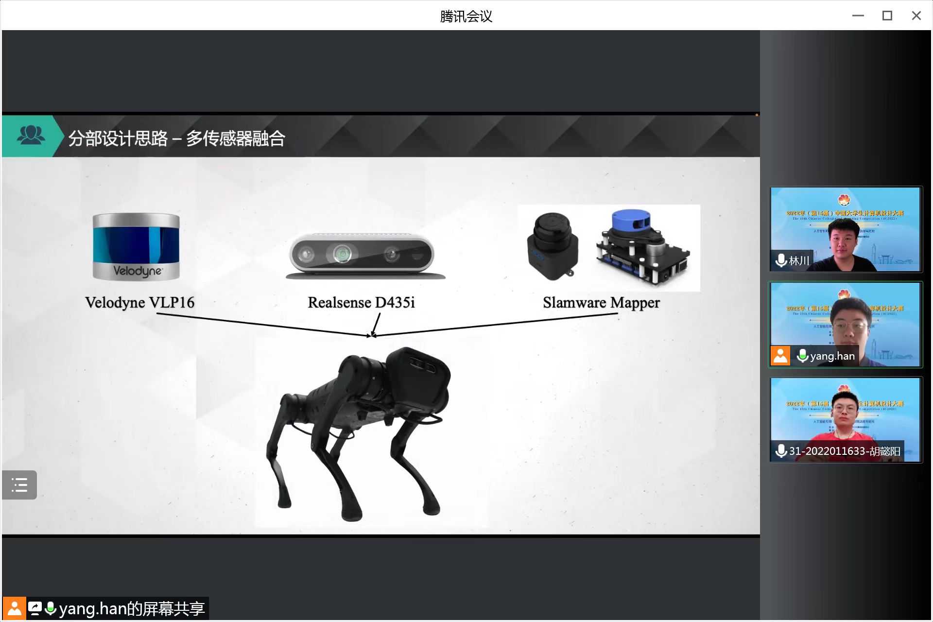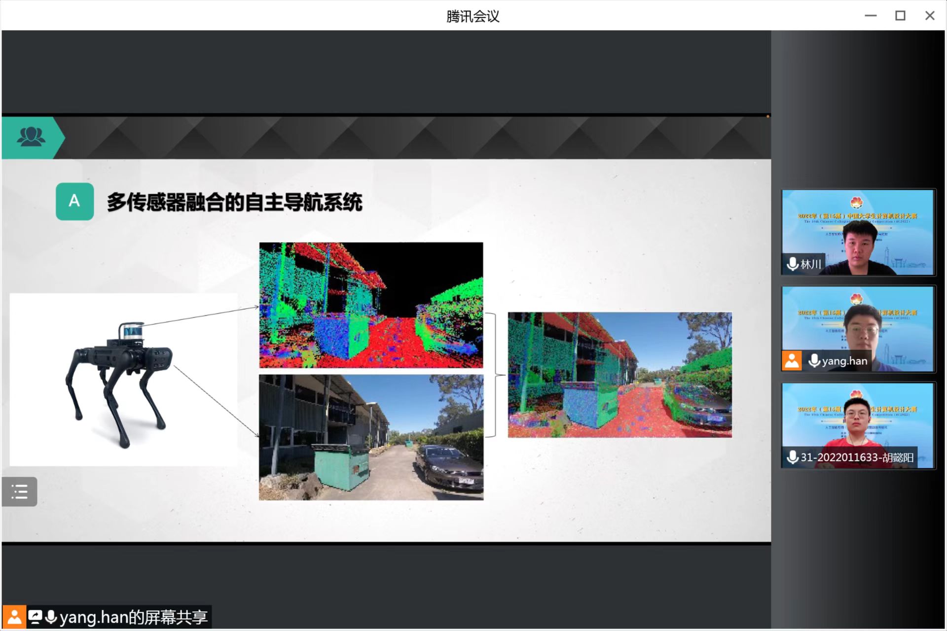 杨涵表示,参加计算机设计⼤赛并不是他们做这个项⽬的初衷,参赛团队也是在项⽬开发过程中⼀步步组建起来的。因为个人兴趣和缓解期末复习的压力,杨涵萌⽣了做⼀个⾃主导航平台的想法,因项⽬制作所需的知识点尚未在校内涉及,他⽆从下⼿。张慧教授为项⽬提供了Unitree Alpha1机械狗平台以及雷达设备,并为项⽬开发制定了时间线以及相关知识点的学习规划,让他们的项目能顺利启动。