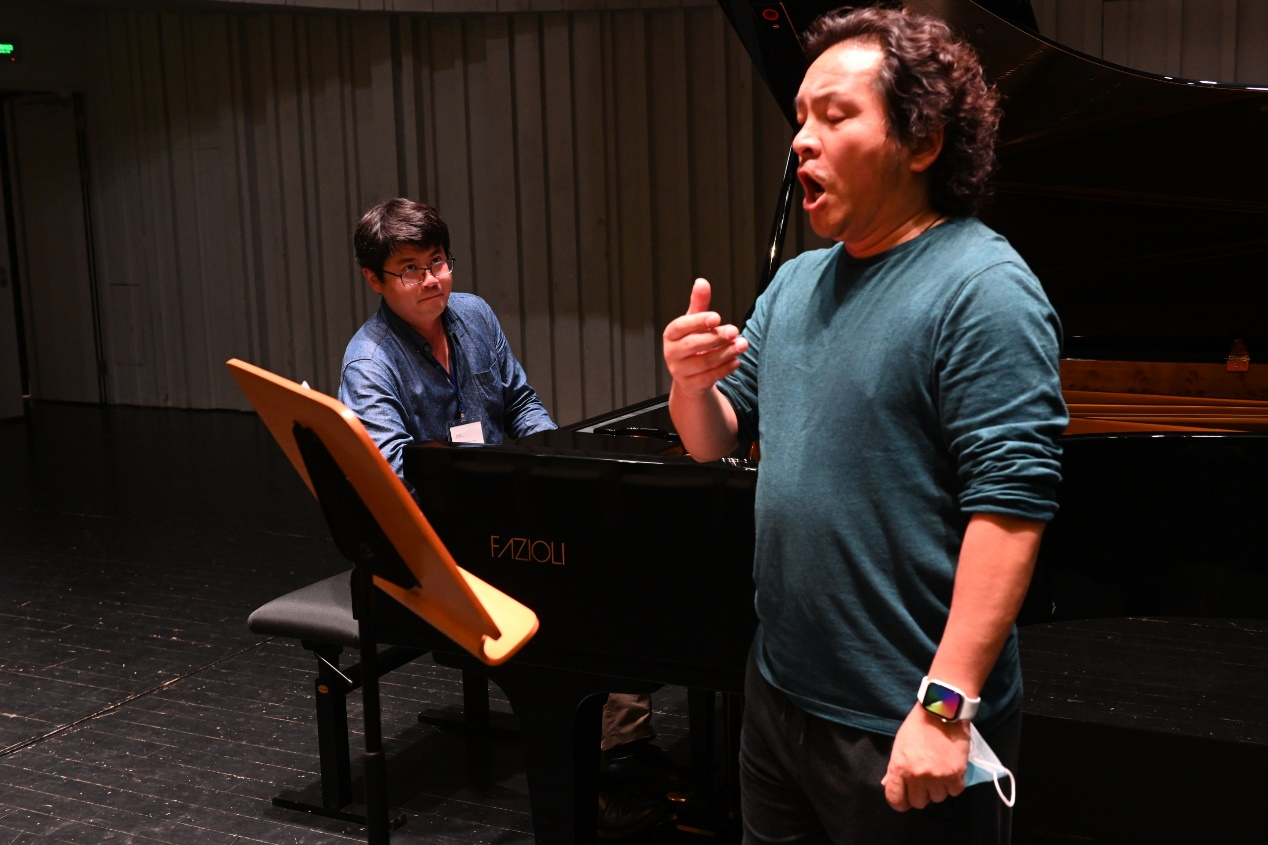 智天皓博士(左)在珠海大剧院与他的朋友排练新作《伶仃洋-唐家组曲》