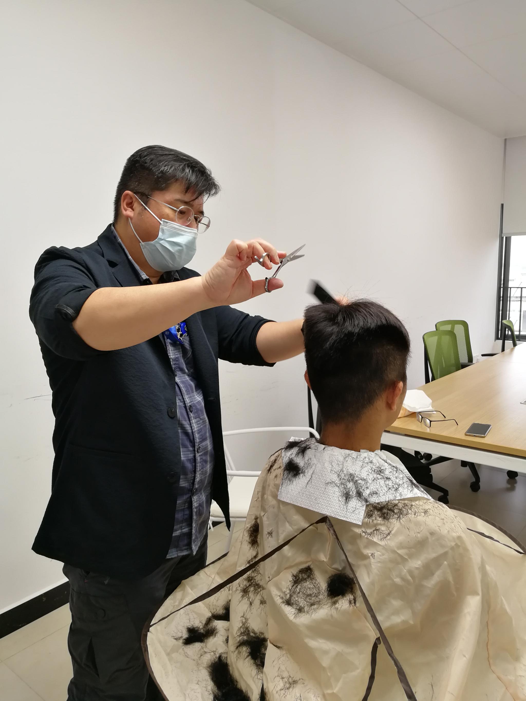 詹肇泰博士(左)为学生理发