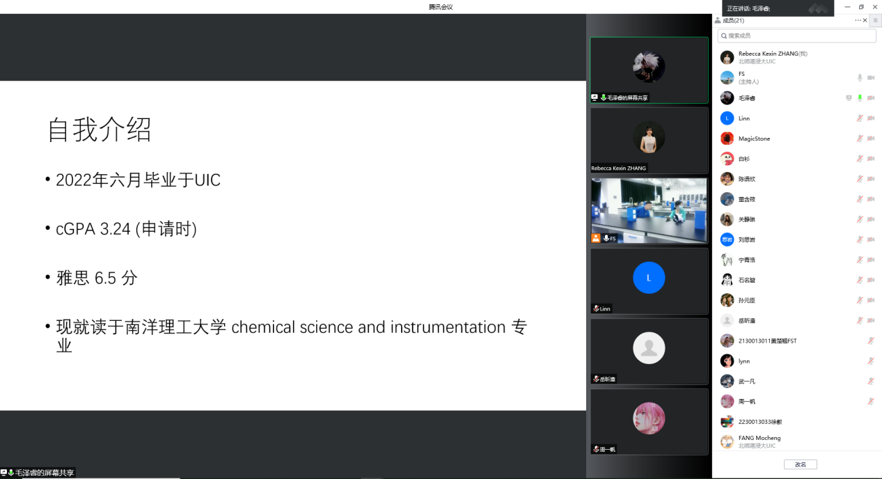 2022年10月25日下午3时,北师港浸大(UIC)生命科学系食品科学与工程专业(FS)举办了一场校友申研及工作分享会。会议通过线上和线下结合的方式进行,线下有7名同学参会,线上有31名同学参会。22届毕业生毛泽睿、21届毕业生周一帆、18届毕业生邹祥、16届毕业生樊林玗依次进行分享,分享会由生命科学系行政主任于晓明老师主持。