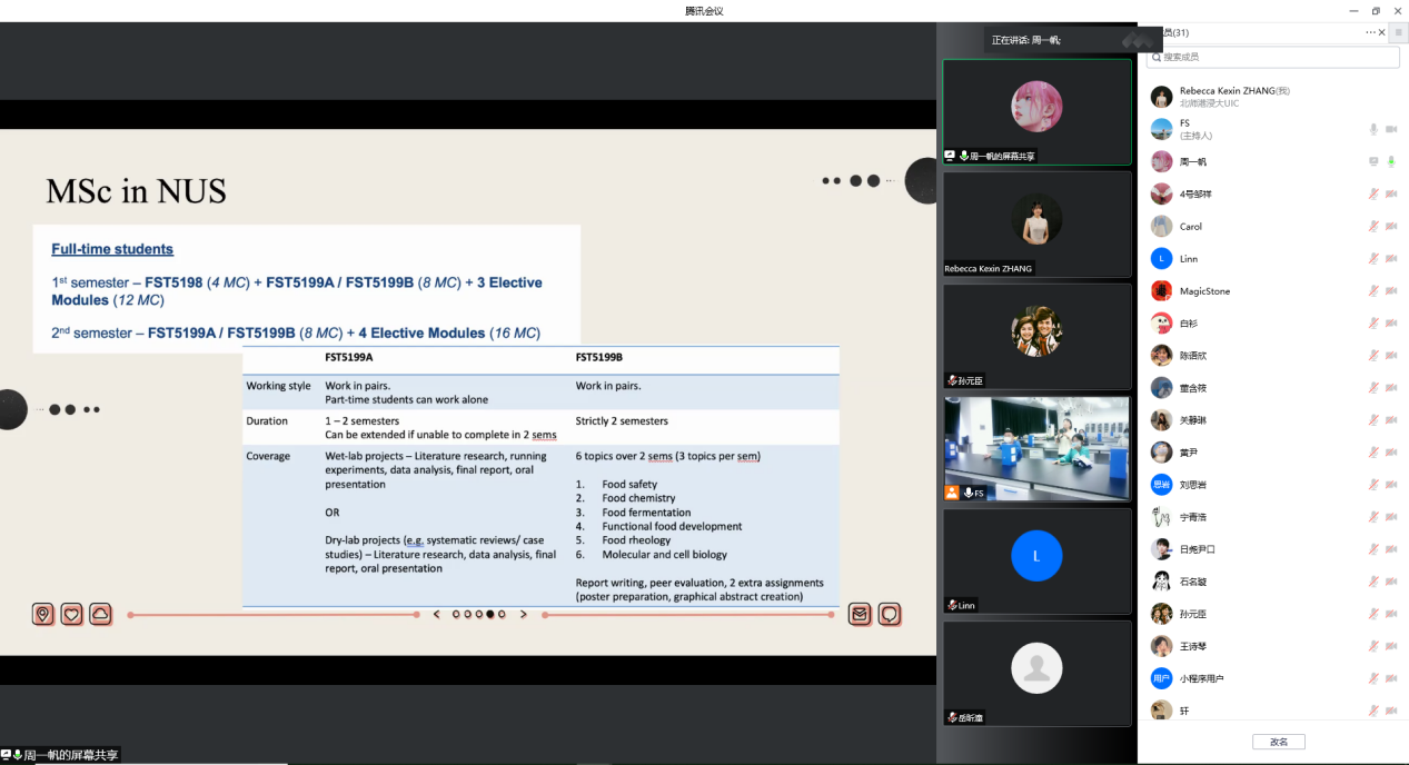 周一帆毕业后赴新加坡国立大学攻读Food Science and Human Nutrition硕士学位。她在本科FYP(毕业论文)期间完成了一篇有关于食品寒热性质研究的综述,最终发表于国际期刊《Food International Research》。攻读硕士期间,在食品权威期刊《Critical Reviews in Food Science and Nutrition》发表了三篇食品与糖尿病/癌症相关的综述。周一帆分享了在新加坡国立大学读研时的课程和学习经历,并对申博流程和步骤进行讲解,主要就申博前期导师的寻找和选择进行了详细分享。