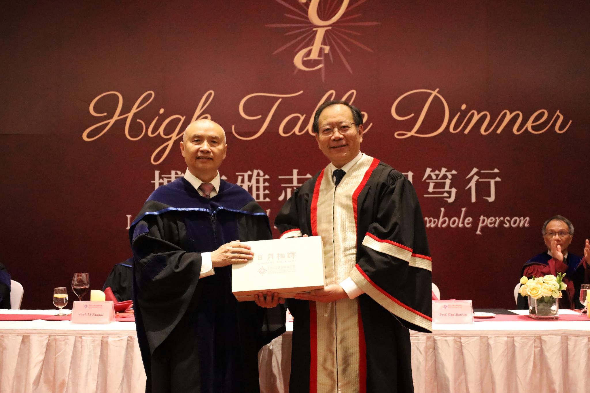 理工科技学院院长潘建新教授(右)向罗跃嘉教授(左)致送纪念品