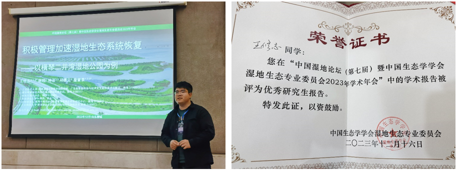 北师港浸大生命科学系环境科学专业与香港浸会大学联合培养的博士研究生王修志参加会议并作了题为《积极管理加速湿地生态系统恢复——以横琴二井湾湿地公园为例》的口头学术报告,分享其所在研究团队在横琴二井湾湿地公园进行生态恢复的实践成果与生物多样性保育成效。该报告获得与会专家的肯定,王修志获评优秀研究生报告奖。