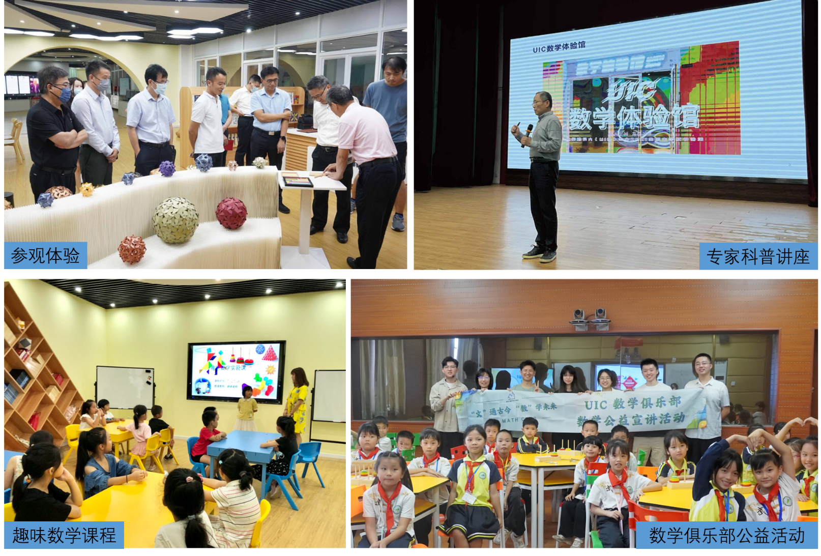 为了更好地普及数学知识、弘扬科学精神,培养青少年对现代数学的正确认识和热情,让少年、青年群体亲身感受数学的魅力,以及它和现代科技的重要关系,UIC数学体验馆面向中小学生、各地大学生等特定人群免费开放参观,组织并接受以学校为单位的数学科普活动。体验馆不断通过数学俱乐部(UIC Math Club)的学生团队,积极吸纳校内具有数学兴趣特长的学生,为数学玩具爱好者提供交流平台;该社团现有37名本校学生,其中理工科技学院学生29人(数学科学系17人、统计与数据科学系5人、计算机科学系7人),其他学院学生8人。