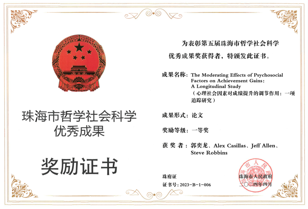 2024年4月22日,第五届珠海市哲学社会科学优秀成果政府奖颁奖大会在珠海度假村召开,展示近年来珠海哲学社会科学取得的丰硕成果。北京师范大学-香港浸会大学联合国际学院(简称北师港浸大,UIC)理工科技学院生命科学系应用心理学专业副教授、教师教学发展中心主任郭奕龙博士及其团队的论文《心理社会因素对成绩提升的调节作用:一项追踪研究》在本次评奖活动中荣获一等奖。