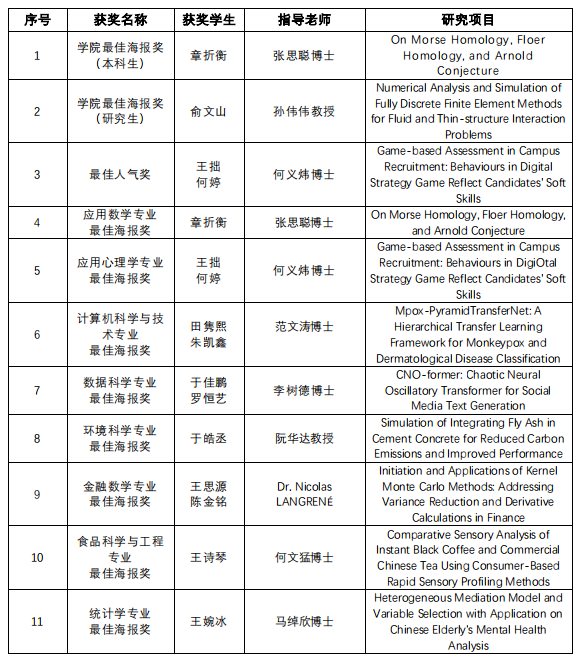 获奖感言:能获得理工科技学院统计学最佳海报奖,对我是一个意想不到的惊喜,也感到特别荣幸。首先,我想要感谢我的导师马绰欣教授。在我做科研的过程中,马绰欣教授的悉心指导,支持和鼓励,一直都是我前行的动力。同时,我也要感谢统计系所有老师的教导。最后,感谢我在统计系的所有朋友们,和大家在一起学习玩乐的每一刻,都是我大学生活中最宝贵和快乐的回忆。我会珍惜这份荣誉,并以此为动力,继续在学术研究的道路上努力前行。