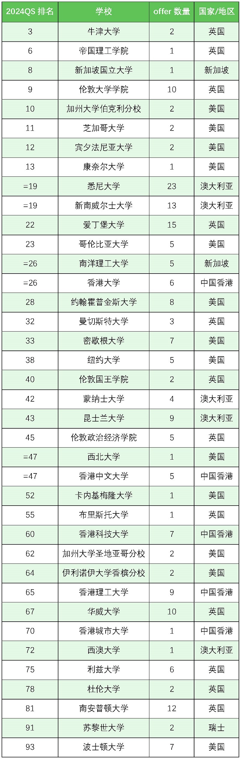 QS前100高校offer数量