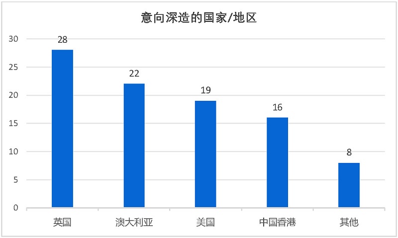 在留学深造的首选国家和地区方面,英国、澳大利亚、美国和中国香港成为学子们的主要选择,分别占比30.11%、23.66%、20.43%和17.20%;其余同学前往新加坡、瑞士或中国澳门等地。