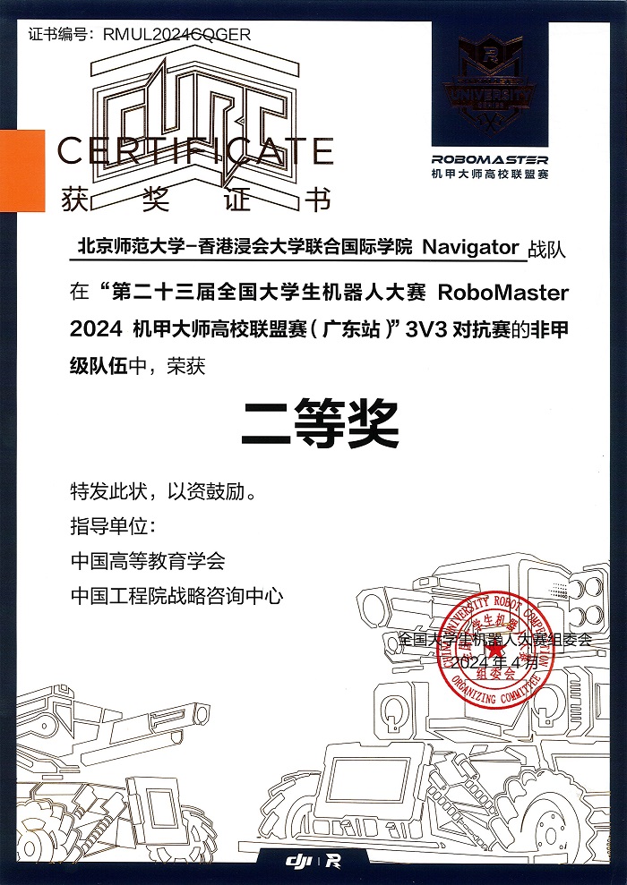 在2024年全国大学生机器人大赛RoboMaster高校联盟赛中,UIC的Navigator战队先后参加了2024年3月26日在重庆大学举办的西南站比赛,以及2024年4月3日在广州城市理工学院举办的广东站比赛,并在广东站“3v3对抗赛”与“步兵对抗赛”两项赛事中荣获二等奖(西南站不参与评奖)。