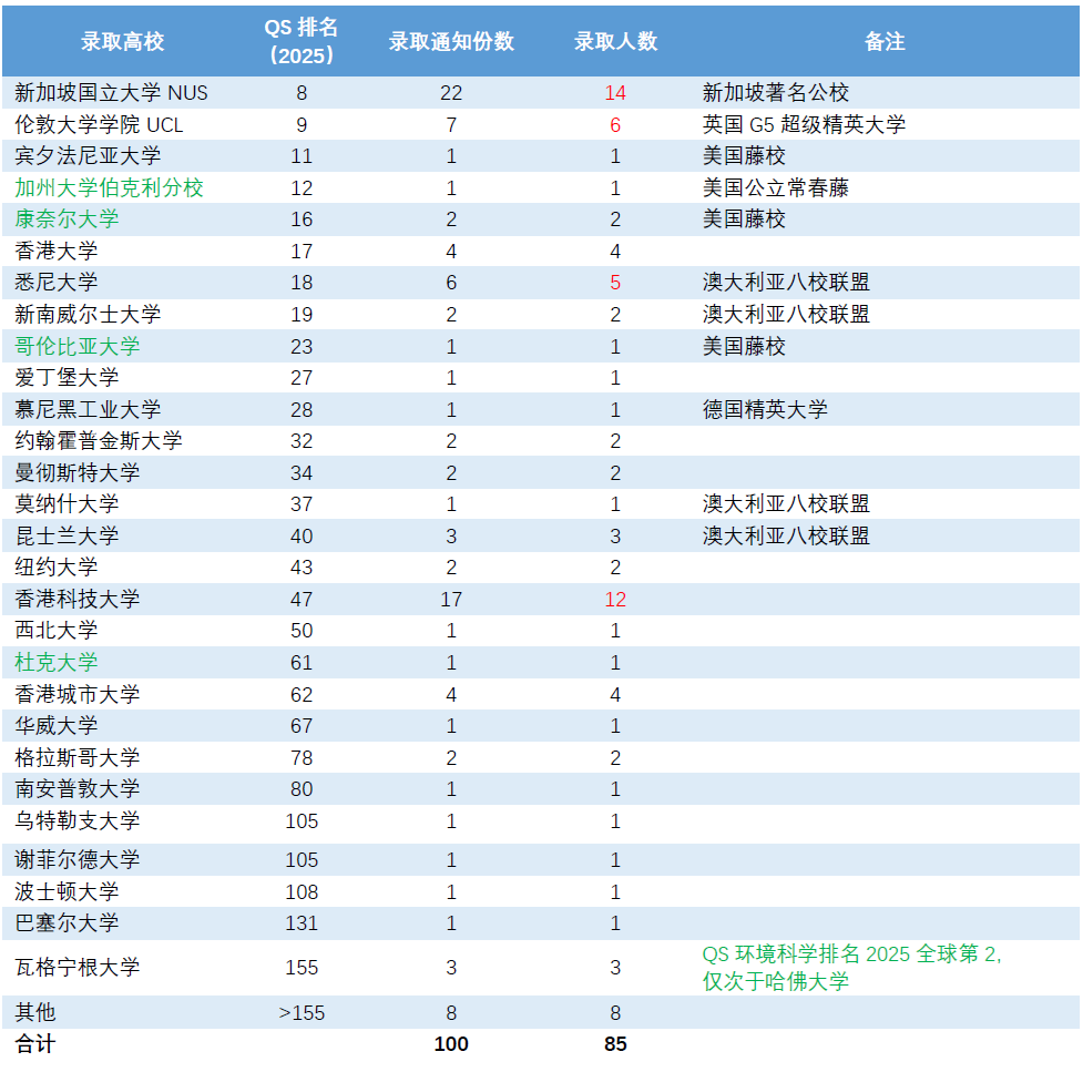 选择升学的31位毕业生目前共收到100份(不完全统计)录取通知,人均超过3份。其中14人(45%)被QS全球排名前10顶尖高校录取,27人(87%)被QS全球排名前50名校录取,28人(90%)被QS排名前100名校录取。最为亮眼的是,选择升学的毕业生有45%被新加坡国立大学(NUS)录取,而且美国名校录取创新高,新增了康奈尔大学和哥伦比亚大学这两所美国藤校以及加州大学伯克利分校和杜克大学这两所顶尖名校。此外,英国G5超级精英大学(主要是UCL)、澳大利亚八校联盟和香港六大公校的录取数据也相当不错,还有一位同学被德国最顶尖的慕尼黑工业大学录取,这些数据再次验证了UIC环境科学专业毕业生的实力。值得一提的是,有两位毕业生分别拿到了美国约翰霍普金斯大学和香港浸会大学的奖学金,可喜可贺!