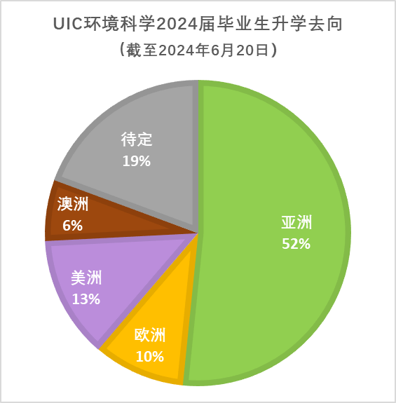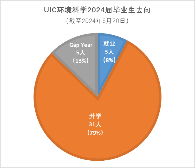 UIC环境科学专业2024届毕业生共39人,截至2024年6月20日,31人(79%)选择升学,3人(8%)选择在中国内地就业,5人(13%)出于个人意愿选择间隔年(Gap Year)。