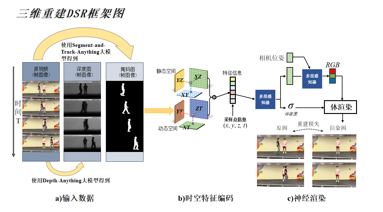 DSR框架首先通过深度估计模型提取视频中的深度信息,然后利用Segment-and-Track-Anything大模型生成障碍物的掩码图,最终结合时空特征编码和体渲染技术,实现高效的三维重建。这一解决方案在提高重建精度和效率方面取得了显著成果。具体而言,DSR框架能够对单视角视频场景进行三维重建,将原本二维的视频转换为具有深度和空间感的三维场景,为后期的编辑和处理提供了更大的灵活性。此外,DSR框架还能移除视频中不需要的动态物体,如行人、车辆等,保证视频主体内容的清晰展现,减少不必要的干扰,使最终的视频效果更加专业和流畅。