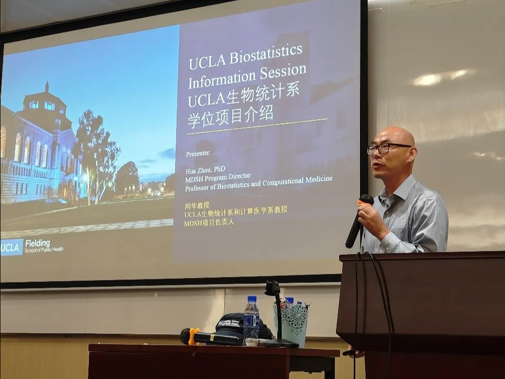第二场讲座由周华教授为学生带来题为“UCLA Biostatistics: Training Next-Generation Health Data Scientists”的硕士项目介绍。周教授首先介绍了UCLA的辉煌历史和卓越成就,特别是该校在全球生物统计领域的领先地位。他提到,UCLA生物统计学项目在2023年全球生物统计项目榜单中排名第七,是全球公认的顶尖项目之一。UCLA的生物统计系不仅历史悠久,师资力量也非常雄厚,包括多位在统计学领域享有盛名的教授,如AAAS等国际重要奖项的获得者。