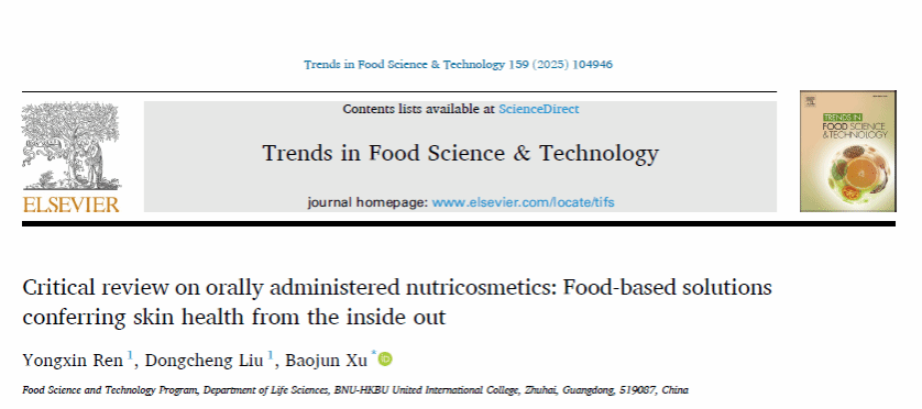 毕业论文时限临近,徐宝军教授建议她转向综述论文。于是任咏忻整合了两年多的积累,以口服营养化妆品为切入点,系统阐述日常食物活性物质如何改善皮肤健康(聚焦痤疮、色素沉淀、皮肤老化三大问题及其分子机制)。这篇高质量论文“Critical review on orally administered nutricosmetics: Food-based solutions conferring skin health from the inside out”发表于国际食品科学顶级期刊《Trends in Food Science & Technology》(影响因子15.1),从写作到发表为时半年。