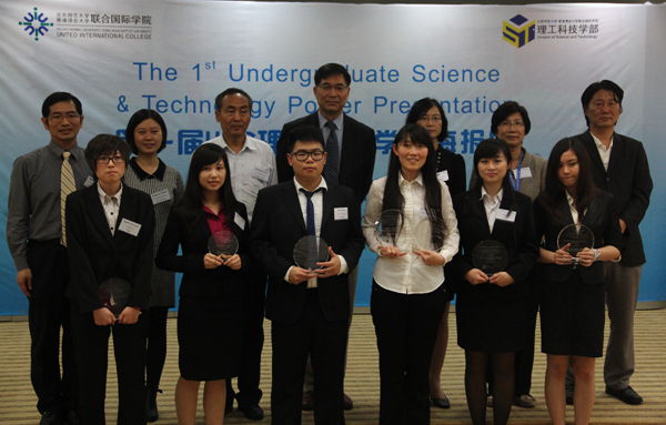 理工科技学部院长钟森文教授和教务长张根发为得奖同学颁奖,并对他们的海报略作点评。