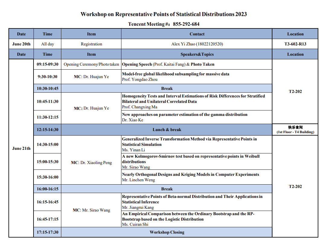 由北京师范大学-香港浸会大学联合国际学院(北师港浸大)统计与计算智能研究所与广东省数据科学与技术交叉应用重点实验室联合举办的2023统计分布代表点研讨会,将于2023年6月20-21日在北师港浸大一期校园召开。本次会议由北师港浸大理工科技学部统计学专业承办,重点探讨不同统计分布的代表点理论、性质与应用,为相关领域的科学研究提供学术交流平台,在科学思想、研究方法、实际应用等方面进行探讨,从而拓宽学术视野,启迪创新思维,促进该领域的发展。本次研讨会邀请了来自纽约州立大学水牛城分校Department of Biostatistics的马长兴教授,南开大学统计与数据科学学院的周永道教授,深圳技术大学助理教授柯笑博士等。采取了线上结合线下的形式,线上有中国海洋大学和吉首大学的师生参与。