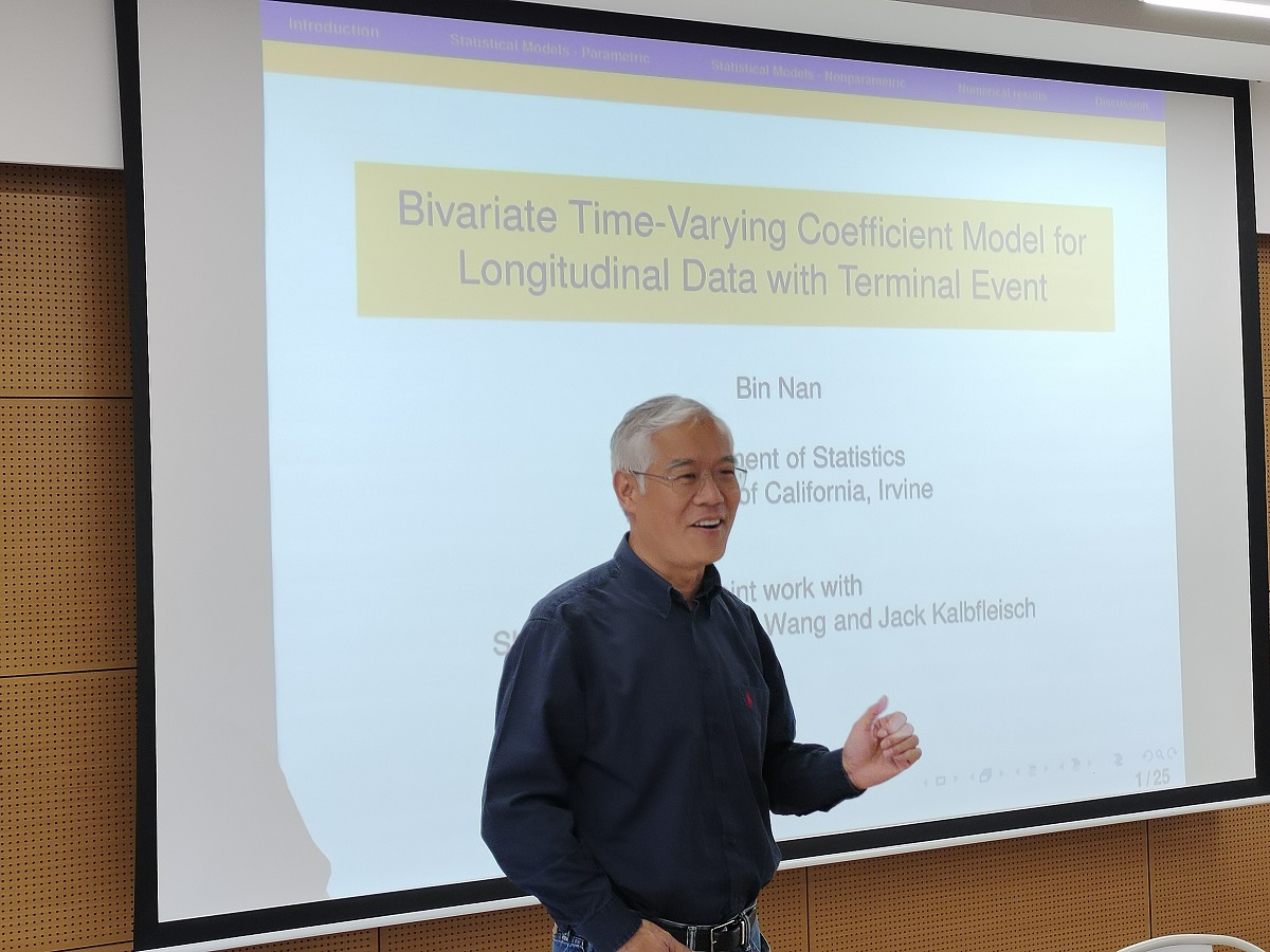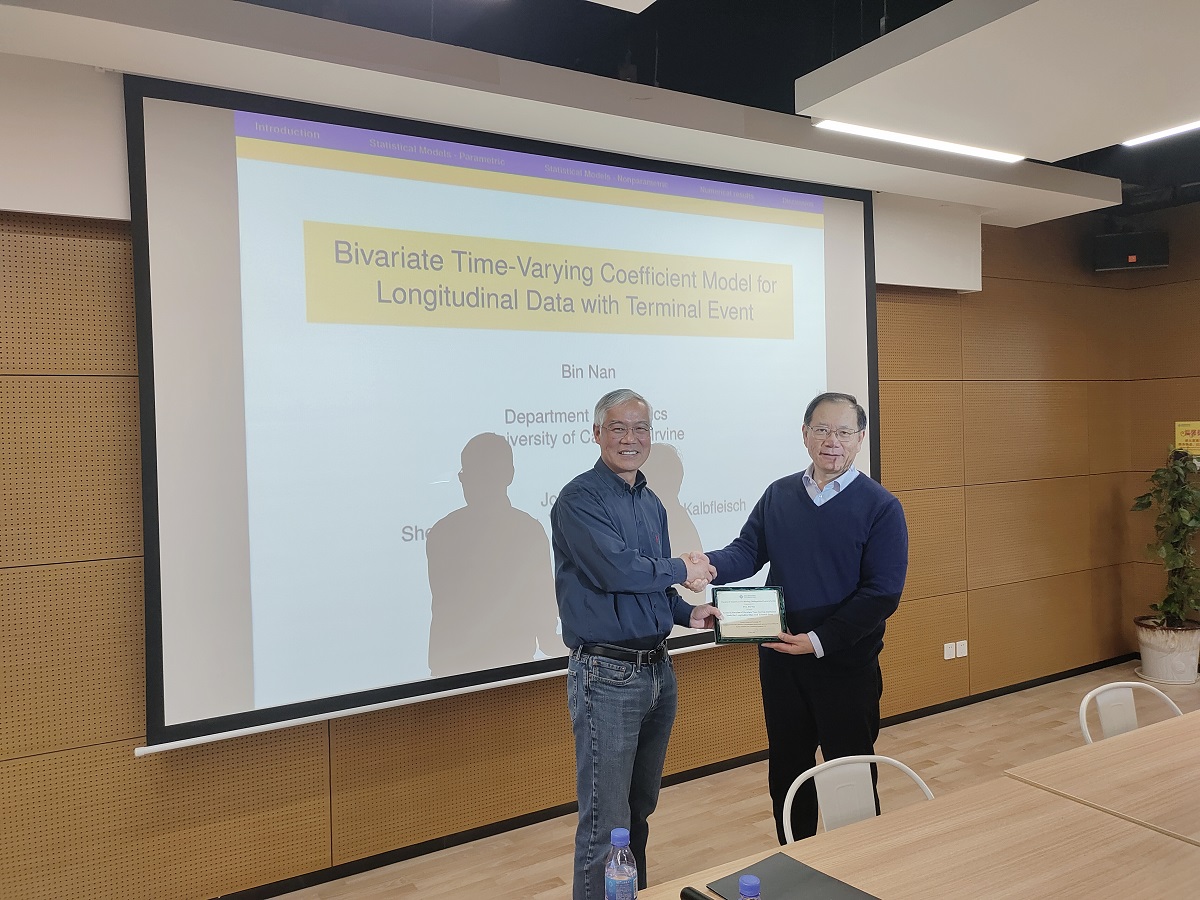 2023年12月19日,美国加州大学尔湾分校统计系南斌教授应北师港浸大(UIC)理工科技学院、广东省数据科学与技术交叉应用重点实验室、统计与计算智能研究所的邀请到访UIC,为我校师生带来题为“包含终结事件的纵向数据二元时变系数模型”的学术讲座。