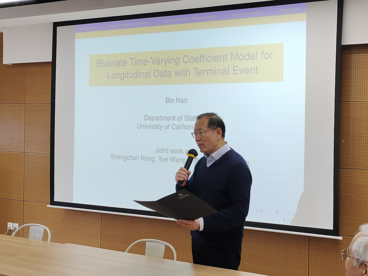 2023年12月19日,美国加州大学尔湾分校统计系南斌教授应北师港浸大(UIC)理工科技学院、广东省数据科学与技术交叉应用重点实验室、统计与计算智能研究所的邀请到访UIC,为我校师生带来题为“包含终结事件的纵向数据二元时变系数模型”的学术讲座。