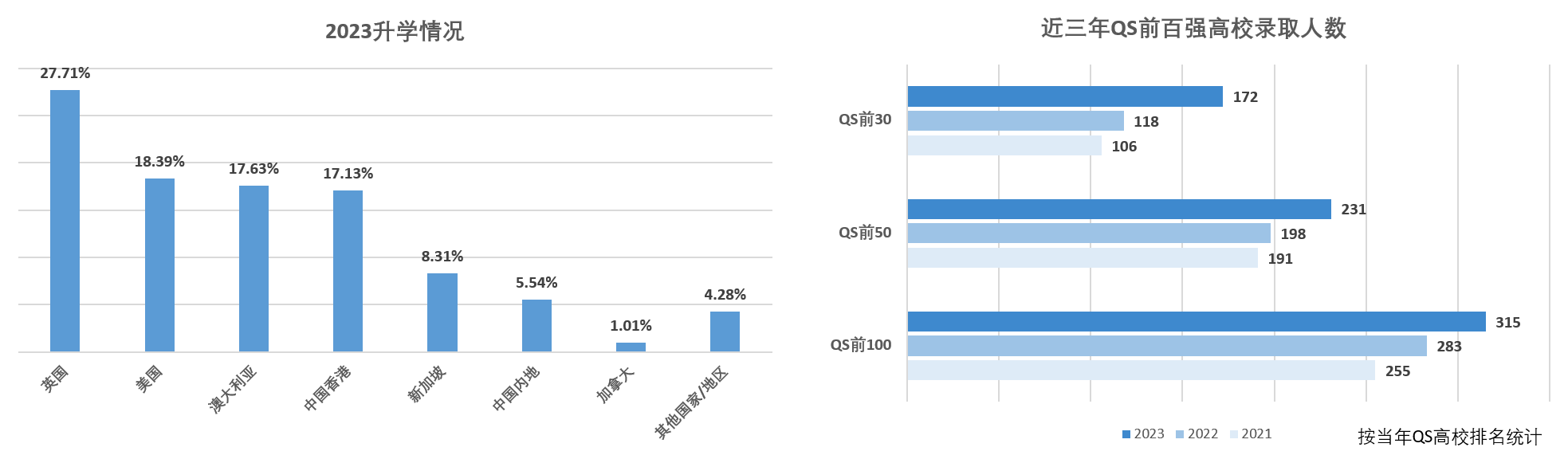 北师港浸大实施英文教学,学术标准接轨国际,每年约八成毕业生选择国内外升学。2023届本科毕业生共463人,其中397人(85.75%)选择继续深造。深造的同学中,43.32%进入QS世界排名前30学府,58.19%进入QS世界排名前50名校,79.35%进入QS世界排名前100名校,主要的留学目的地为英国、美国、澳大利亚、中国香港、新加坡等(以上数据更新至2023年12月)。
